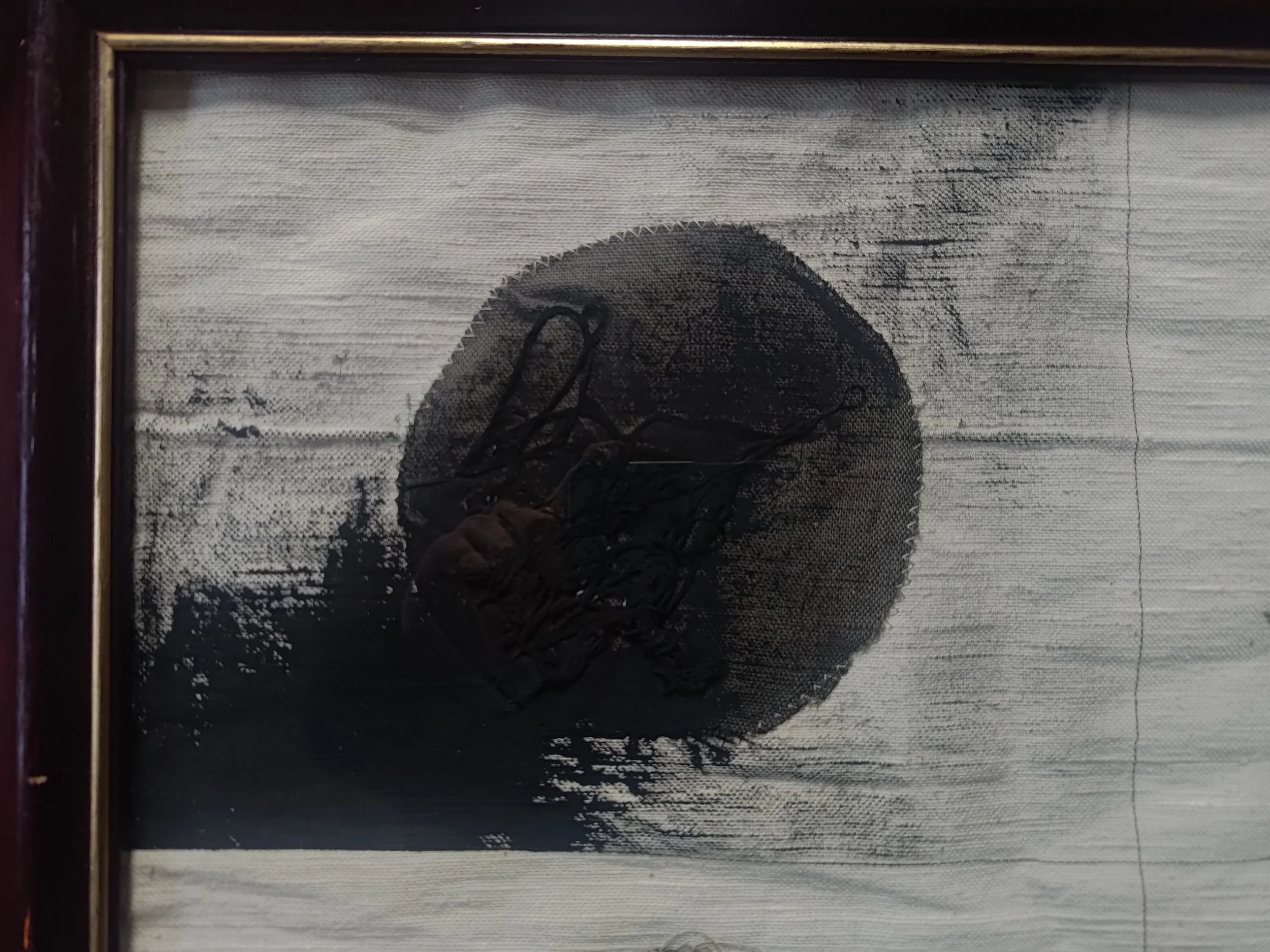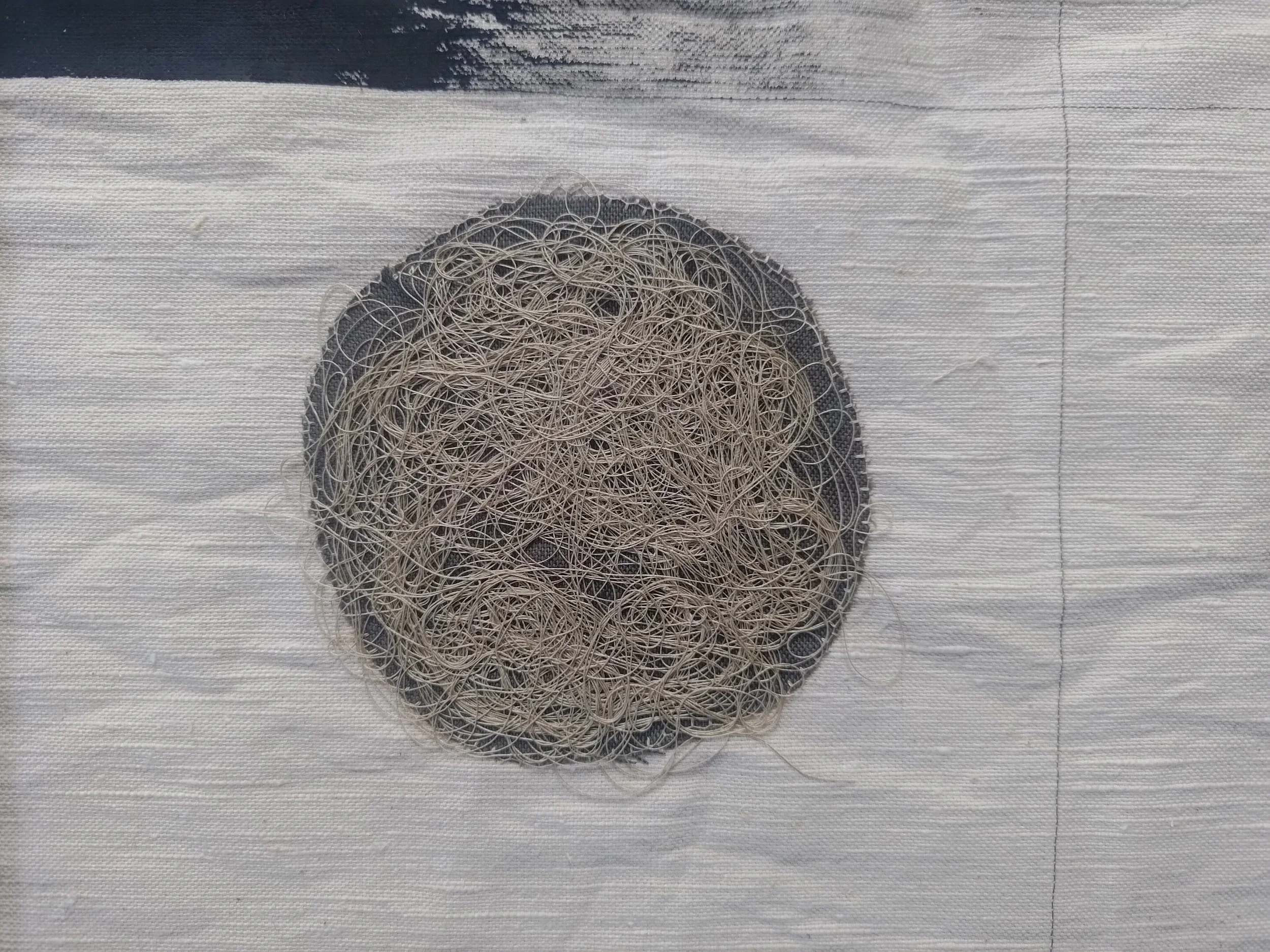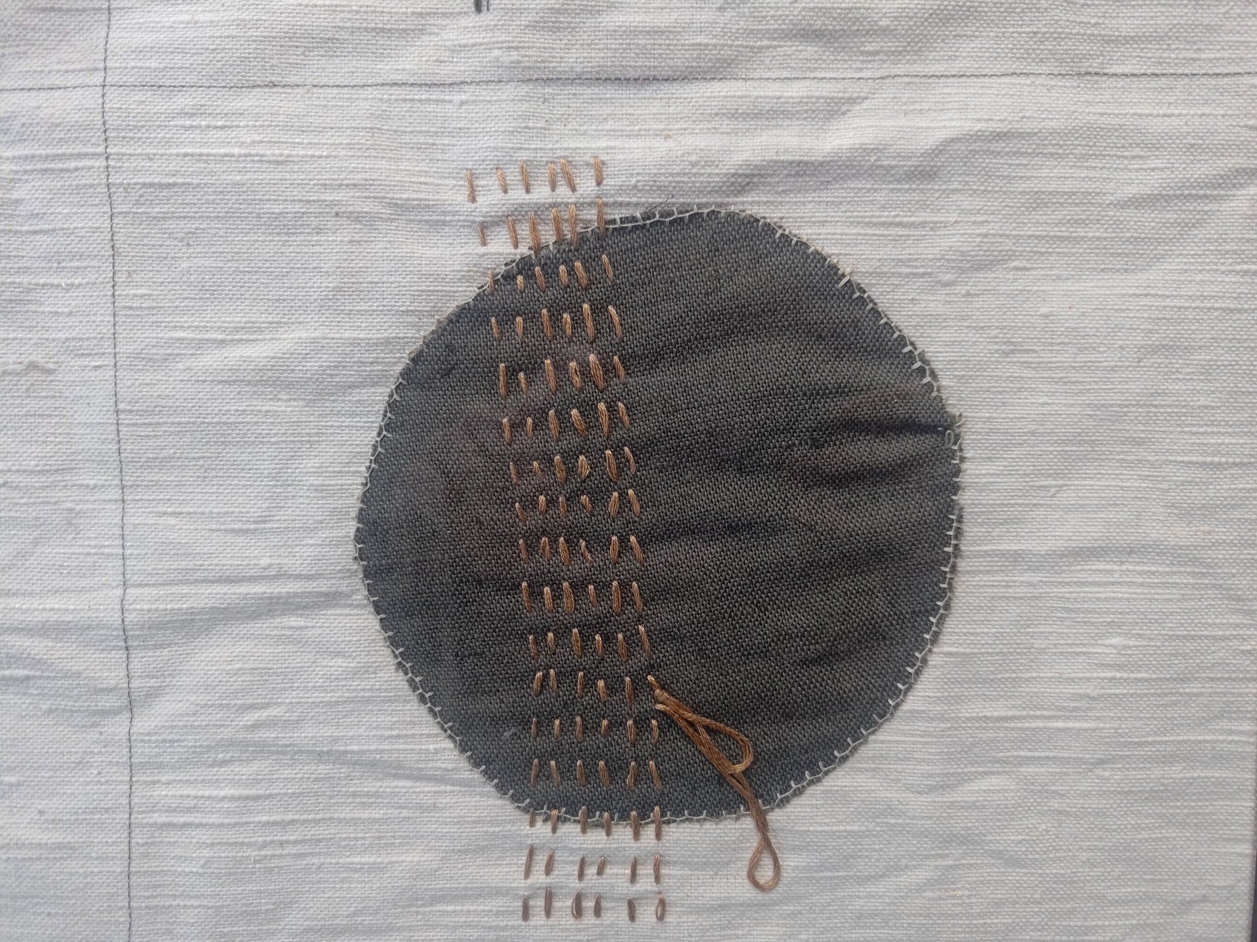 This piece is about healing, imagined through the imagery of a blister. The second circle stretches out like a blister’s skin, the third fills itself with liquid and the 4th, despite the process being complete, still has a pinch or two in the skin as it efforts to grow back normally. The loose meaning of the 4 circles are: the affect moment, analysing, healing, and growing, the link with sashiko and visible mending at the end of the process maybe a little twee.